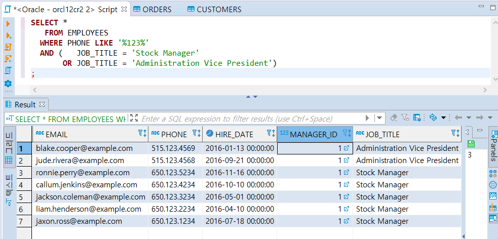 4) AND, OR 사용하기 / PHONE 넘버에 123이 들어가고, JOB_TITLE이 'Stock Manager' 이거나 'Administration Vice President'인 사람의 모든 데이터를 보여줘