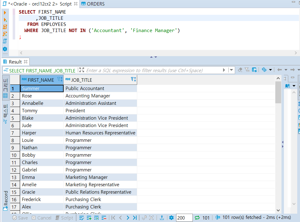 5) 부정 SQL 연산자 사용하기 / JOB_TITLE이 'Accountant' 'Finance Manager' 에 속하지 않는 사람의 FIRST_NAME과 JOB_TITLE을 보여줘