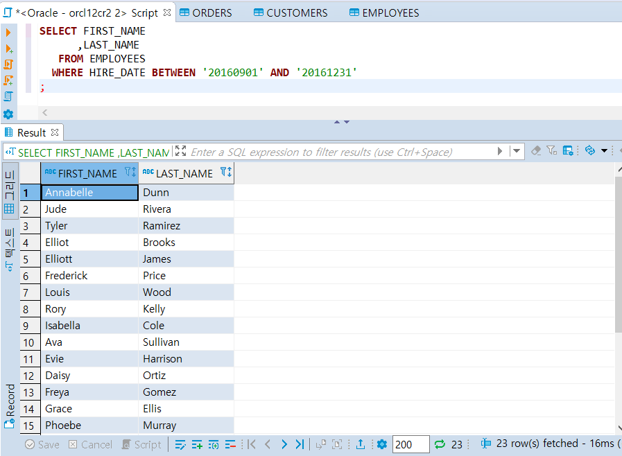 2) BETWEEN 연산자 사용하기 / EMPLOYEES 테이블에서 HIRE_DATE가 2016/09/01~2016/12/31 사이인 사람들의 성과 이름을 가져와줘!