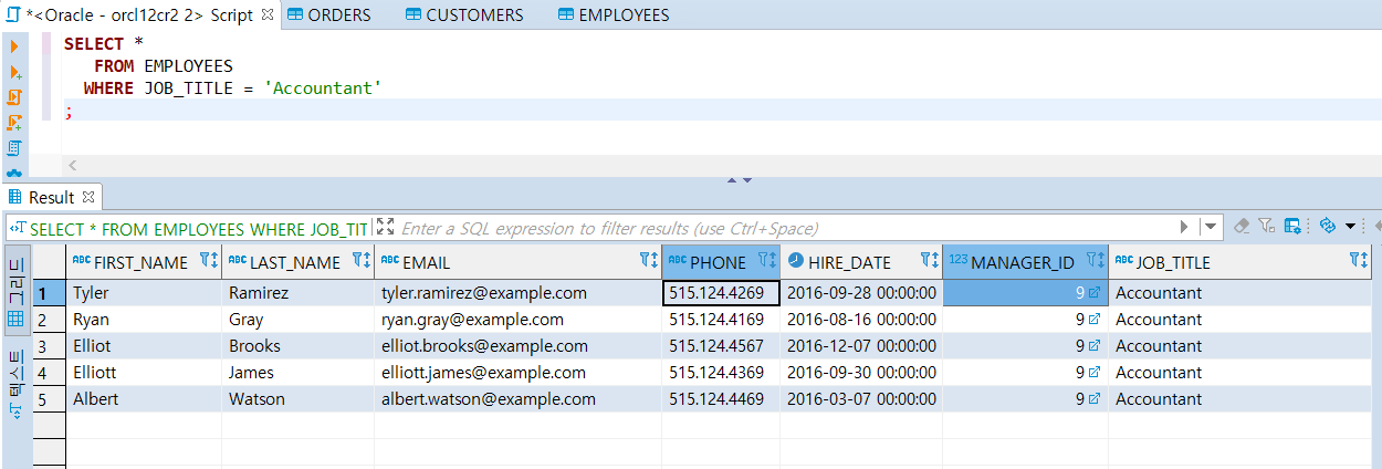 1) 기본 WHERE문 / EMPLOYEES 테이블에서 JOB_TITLE이 'Accountanta'인 모든 data를 가져와줘!